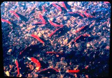 Salmon experience physical changes while spawning. They no longer eat and must rely on their body reserves. Most species turn red and the males develop hooked snouts. Males and females form pairs once they reach the spawning grounds. Females lay several nests of eggs for the males to fertilize. Each nest is then covered with protective gravel.