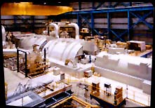 The turbines in this building are powered by steam generated from the heat in the reactor vessel. The turbines send power to an electrical generator. Once the generator is running, the process of turning steam energy into electrical energy is complete.