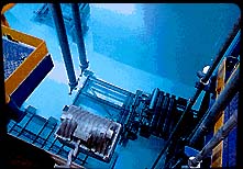 A nuclear fuel bundle is depleted after 18 months. Used nuclear fuel is highly radioactive and is toxic to all life forms. The spent fuel is sealed and placed in a pool at the power plant. After five years, it is moved to an outdoor cement container for storage. Spent fuel can harm life forms for thousands of years.
