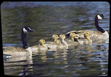 Young geese, or goslings, stay close to their parents because they are prey to many animals. They learn to swim almost immediately so they can escape from predators. The female goose usually leads the goslings and the male goose follows close behind.