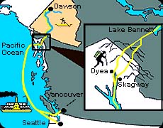 sailed to Skagway and Dyea hiked over the Coast Mountains built boats at Lake Bennett floated down the Yukon to Dawson